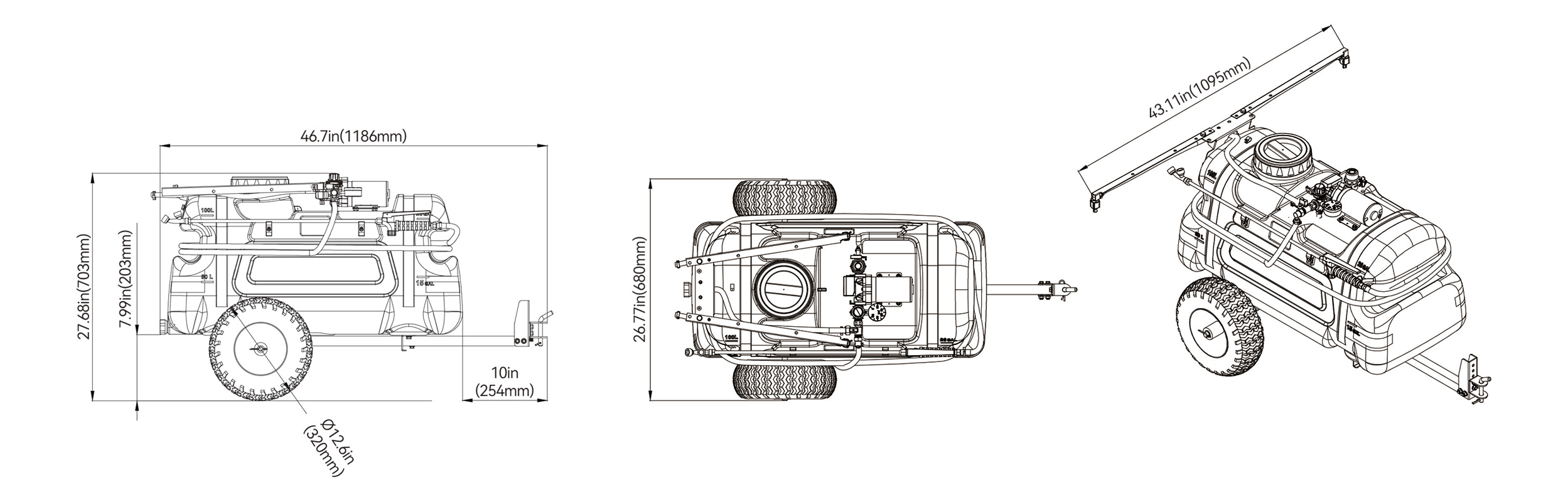 INDFLO15/25加仑拖车式喷雾器配备专业级农用泵,内置保险丝。采用抗紫外线高强度HDPE材质水桶,搭配大容量进水口。多喷臂可自由调节,方便进行大面积作业。多喷幅宽度达3080毫米,喷幅半径达1000毫米。这款小型车载喷雾设备非常适合用于草坪、花园和灌木的喷洒、除草和灌溉,以及清洗围栏、栏杆、玻璃、地板等。